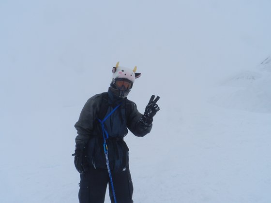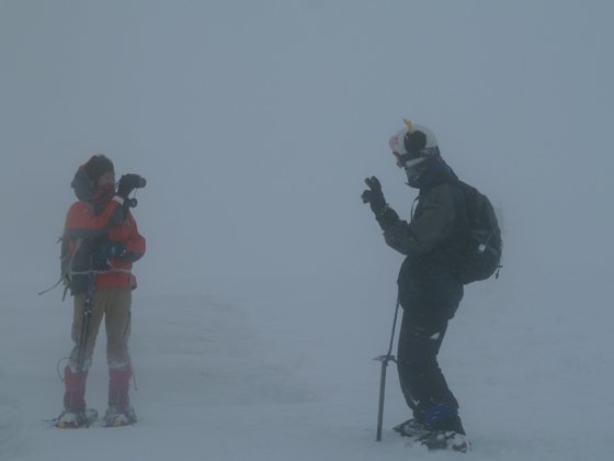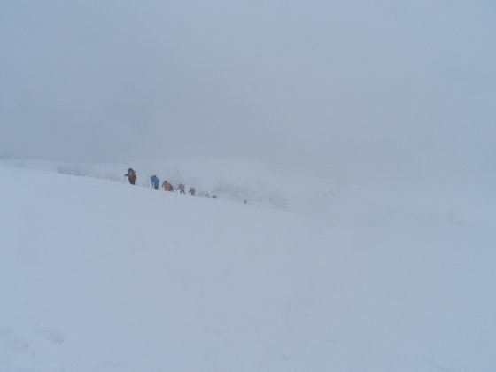 寒い~~フードから出た髪が凍ってきた。早々に引き上げる。下山しかけるとブリザードもおさまりかけてきた。上がってくる登山者も多くなってきた。
