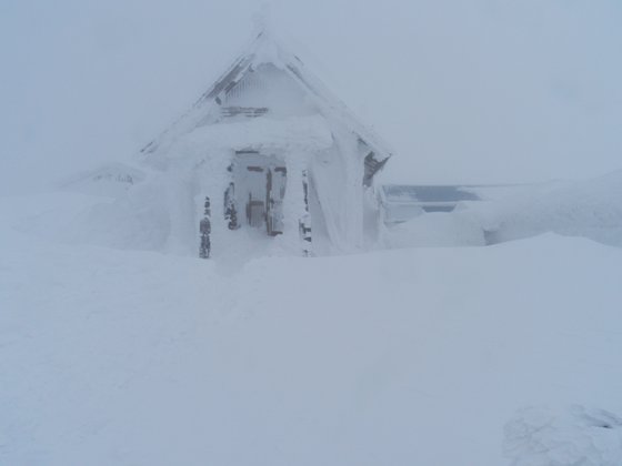 視界はなし。ホワイトアウトだ。まっ、いいか。6合目避難小屋はもうすぐだと思うから、先に行こう。風が粉雪を吹かしてトレースをなくそうとするが、しっかりみれば確認できる。もう少しだと思った避難小屋にたどり着かない。少しだけ不安になったが、しばらくして避難小屋が見えてきた。ホワイトアウトで時々見えなくなる。ひとりで歩いていると雪中耐寒訓練しているみたいだ。なんか強くなりそう~。今日会った登山者は男性ばかりだ。女性の登山者はこんなお天気だと登らないのかな。
