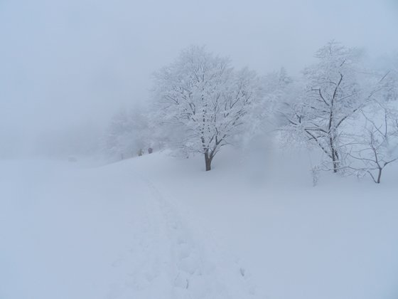 初めて女性登山者とすれ違う。下山は好きな所を下る。誰も歩いてないまっ白な雪の上をスノーシューで滑るように下る。わぁ~楽しいな。今日の一番の楽しい時間だ。気持ちいいな。吹雪きもなくなったし、でも、遠くの展望はない。一気に登山者が多くなった。