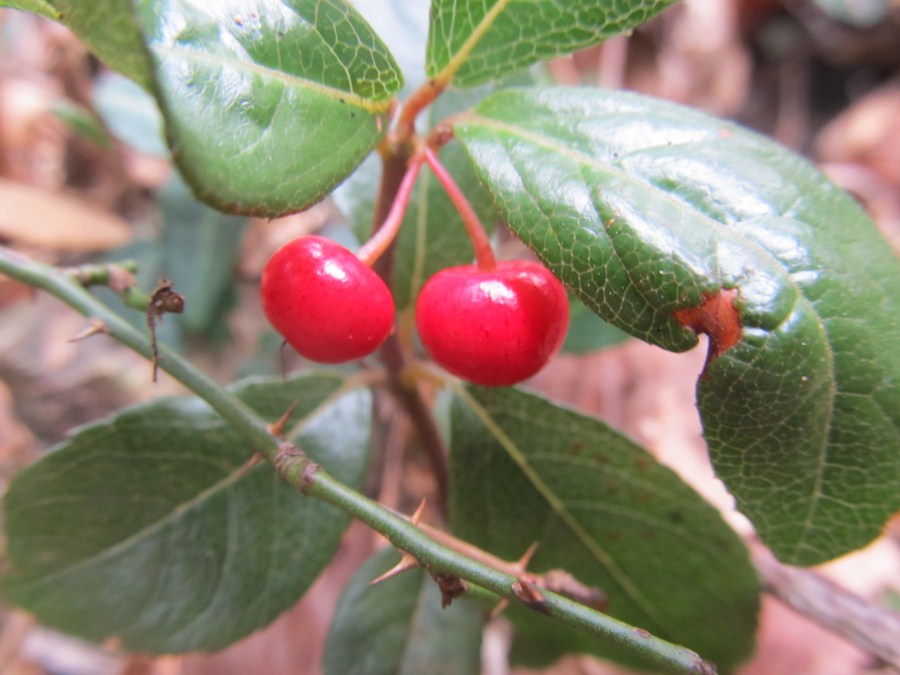 ヤブコウジの画像に棘のある枝が写っていたけど、このあたりも棘のある木があるんだよね。