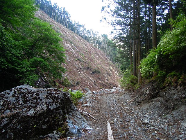 マナコ谷下の千秋林道の小屋裏は、伐採され作業道ができていた。