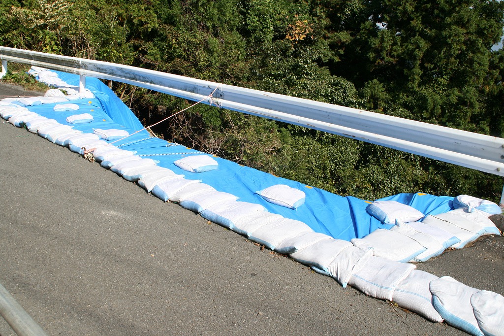 谷側の道路が幅1m程度、10mほど無くなっているところがあった。ブルーシートが掛けられ、土嚢が並べられ、雨が降ってもそこに水が流れないようにしてあった。ここは、直すのには時間がかかりそうだ。