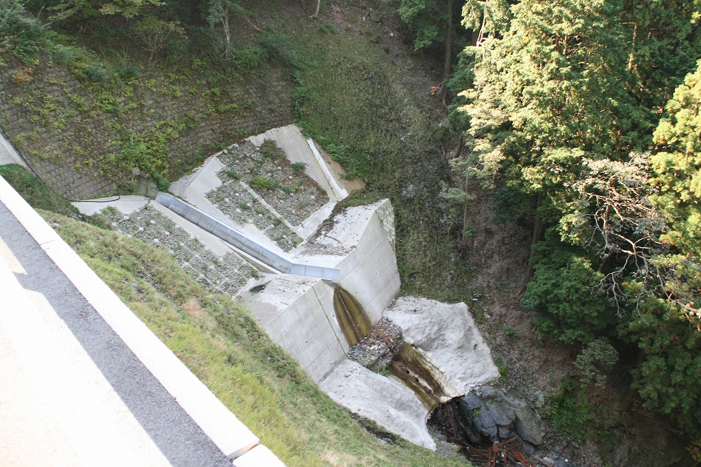 タテ谷も土石が流れた跡があった。道路は谷側が壊れていた。アスファルトの下が無くなって空洞になっていた。タテ谷を登ってみた。四段の砂防ダムは、土石が満杯だ。もう、砂防ダムの機能は無いように見える。