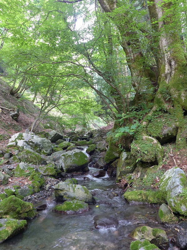 癒しの谷だ。ひな壇上の落ち込みが大木を縫うように流れている。