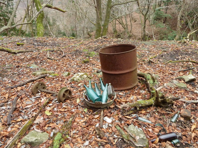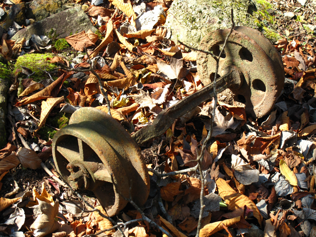 > 飯場跡には御池鉱山まで鉱石を運んだトロッコの車輪や刻印レンガがありました。
