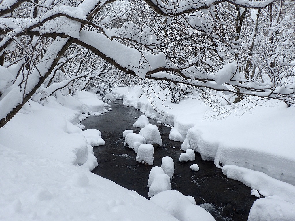橋を渡って左折し、ハライド方面へ向かってみるが、山小屋のトレースがなくなるとツボ足では腿まで潜って前進不可能。武器がないので戻って根ノ平、鳩峰方面へ続くスノーシューの跡を黙々と追う。時々ごっそり踏み抜く。砂防公園からヘアピンへ進む。中峠方面踏み跡なし。さらに進むと戻ってくる登山者と出会う。「僕の実力ではこれ以上無理です」とおっしゃる。こちらはトレースを使わせてもらっているので分からないが、相当深いのだろう。先にもう一人いるらしい。林道と猫谷分岐手前でその人も戻ってきた。スノーシューで一番トレースを付けた人だ。縄弛み堰堤まで行って疲れたので戻ったそうな。