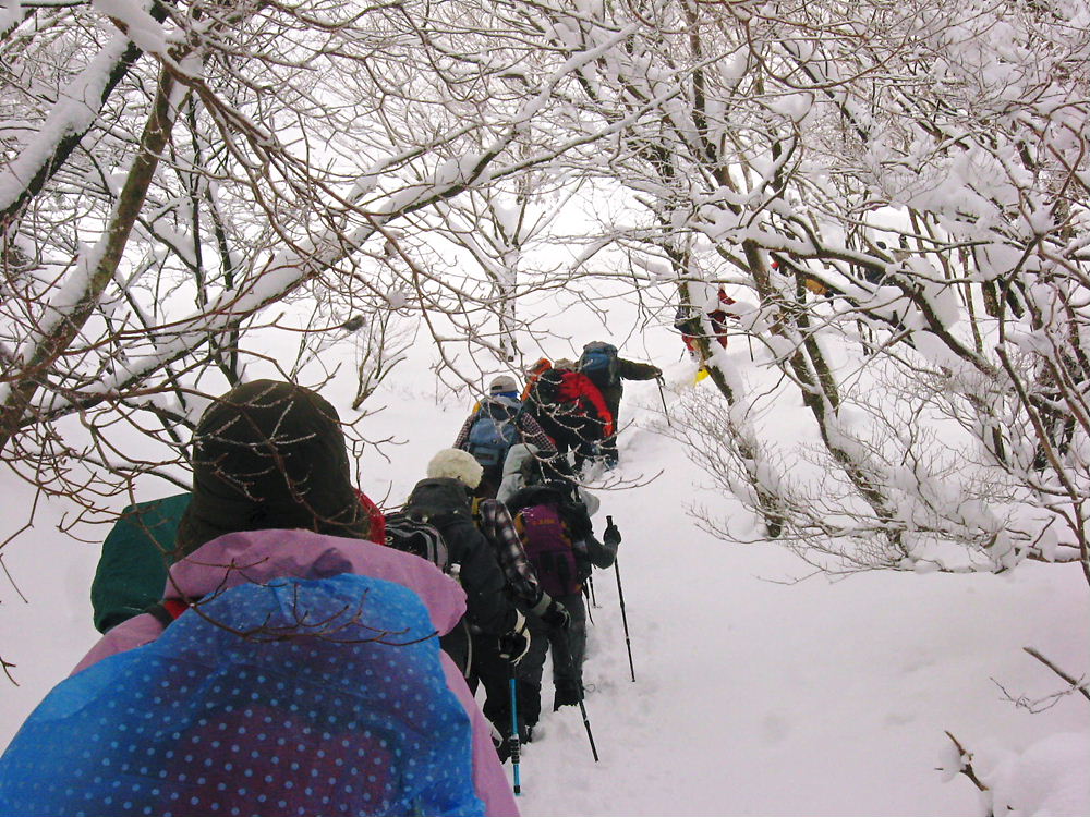 ● 雪が深くなってきた、力を合わせてつぼ足登山