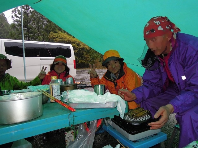 グーさんが登場前に、てんぷらあげてたら一度タープのペグが抜けたんだよ。