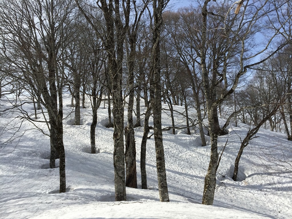 ゲートのところあたりから取り付くのがいいと思います。籾糠山の北面のP1393あたりがブナ林がよかったと
