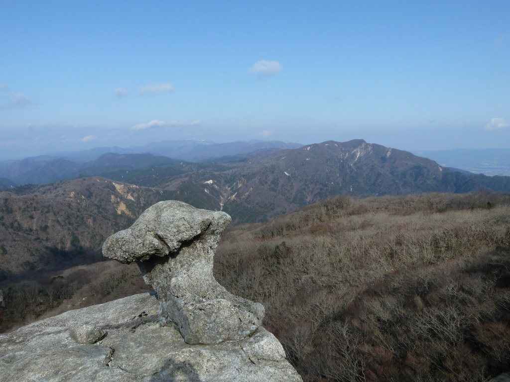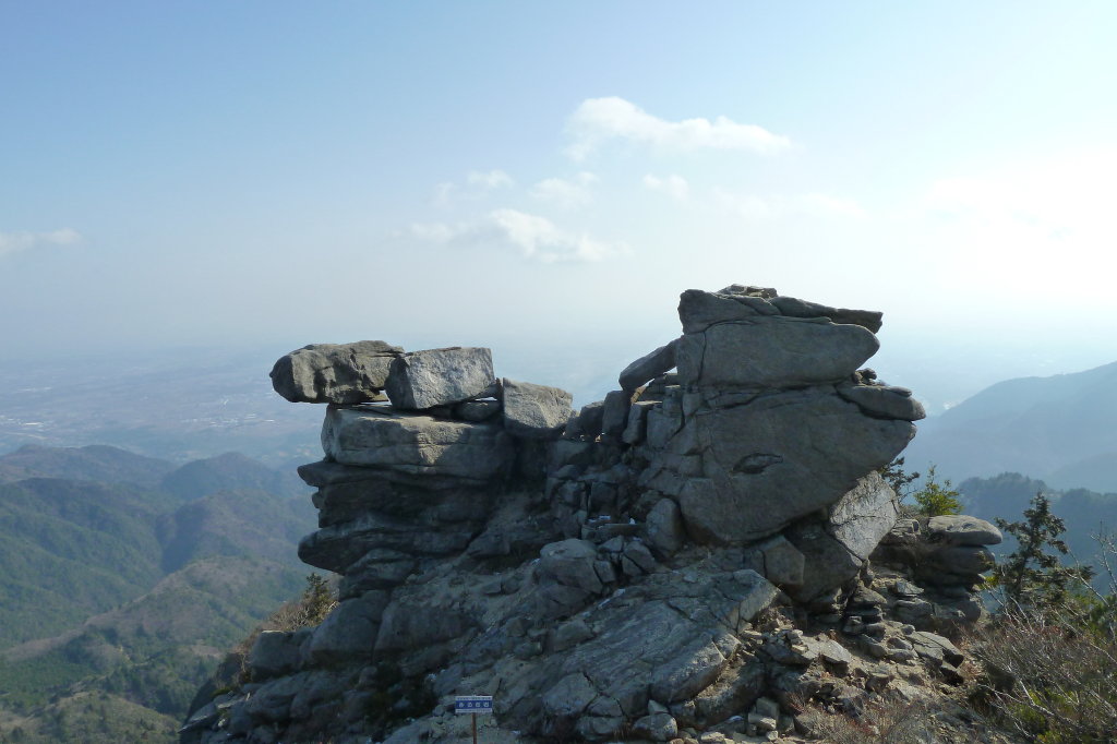 ランチ場を探す前にとりあえずチOポコ岩にご挨拶しておこう。ここから岩越しに望む釈迦ヶ