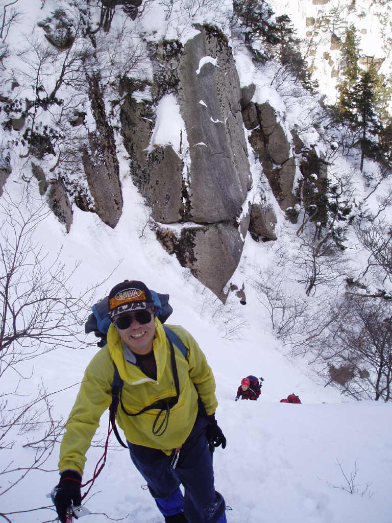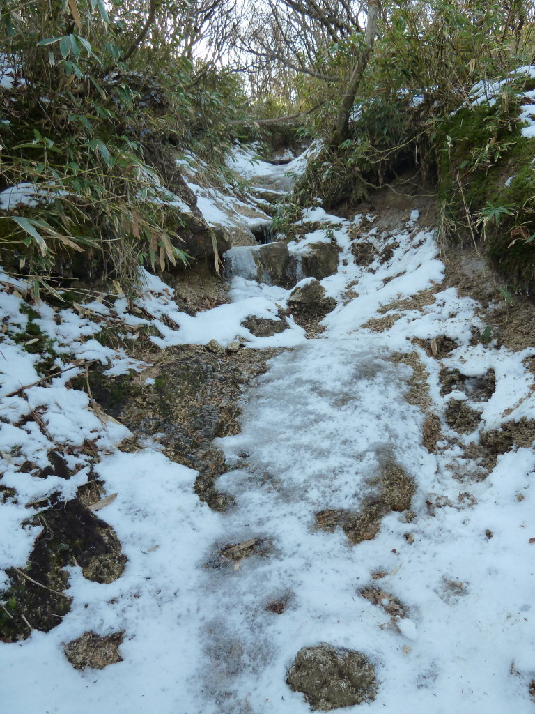 だった。日当たりの悪い北面の急斜面はミニ氷瀑が続く連瀑帯を下るような感じで危なっかしい
