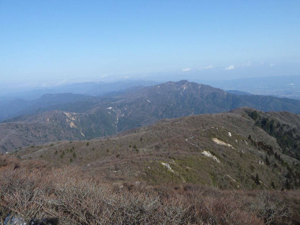 御在所と国見が重なるように見え、左に目を転じれば入道と雲母峰が続く。ハライドの山頂では