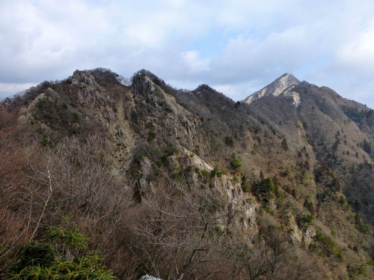 に下り登り返して東側のピークに着くが、ここも眺望はよい。これから歩く鎌尾根の向こうに鎌ヶ岳の姿が見える。