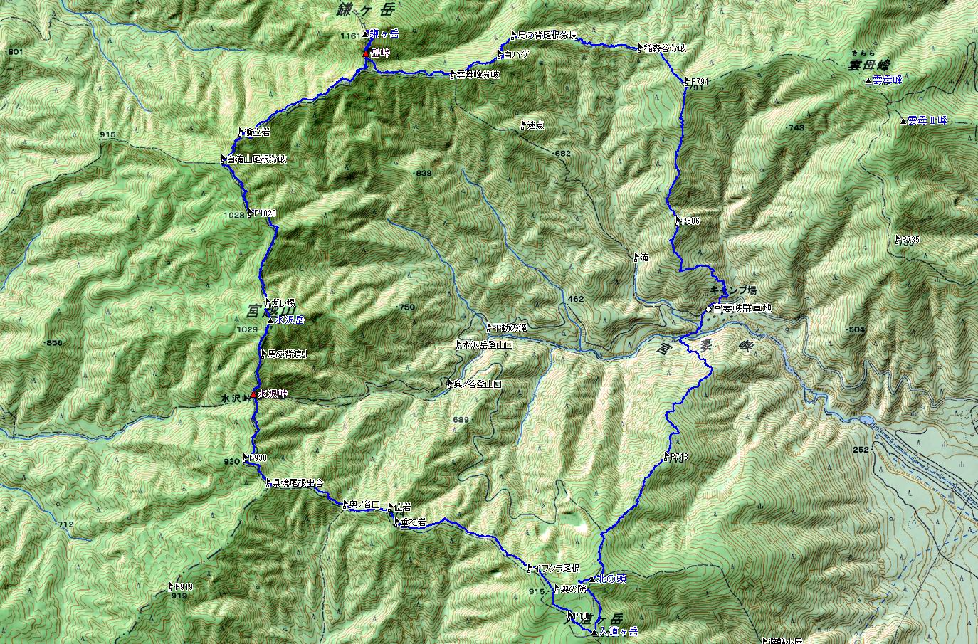 > 当時私は雲母岳南東峰(Ⅱ峰?)の南西尾根を降りました。そうすると、入道、水沢、鎌、雲母の4峰が一日で踏めるという寸法です。