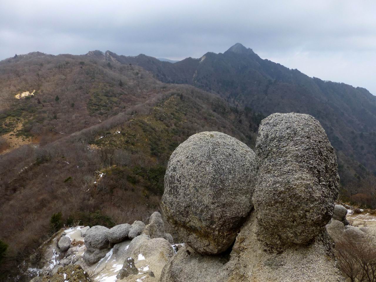 綿向山から雨乞岳にかけての稜線がくっきりとしている。雪は少なく歩くには支障はほとんどない。やがて岳峠の手前の岩頭にや
