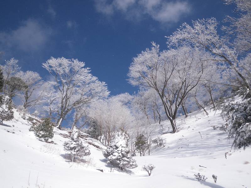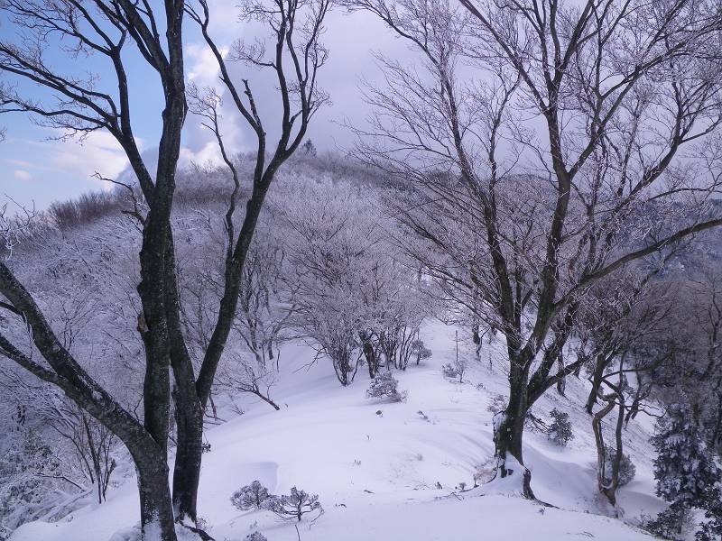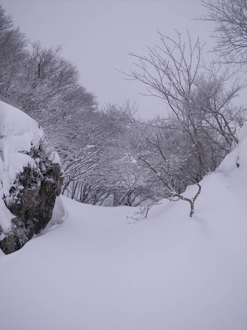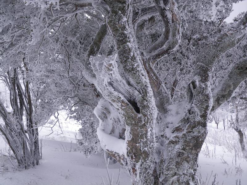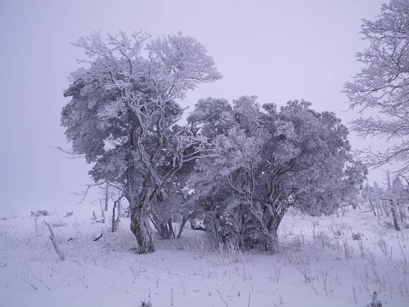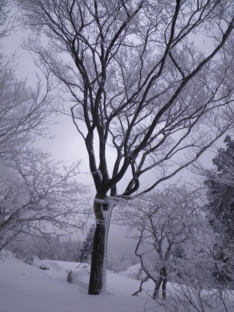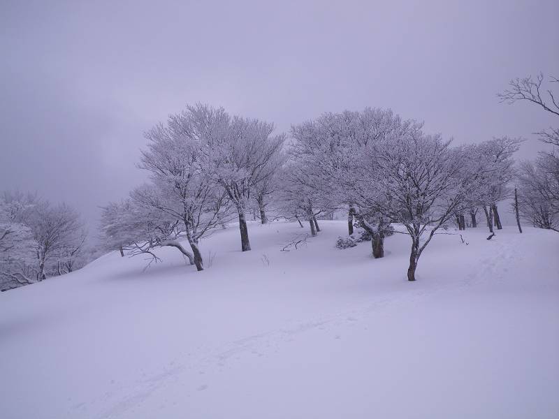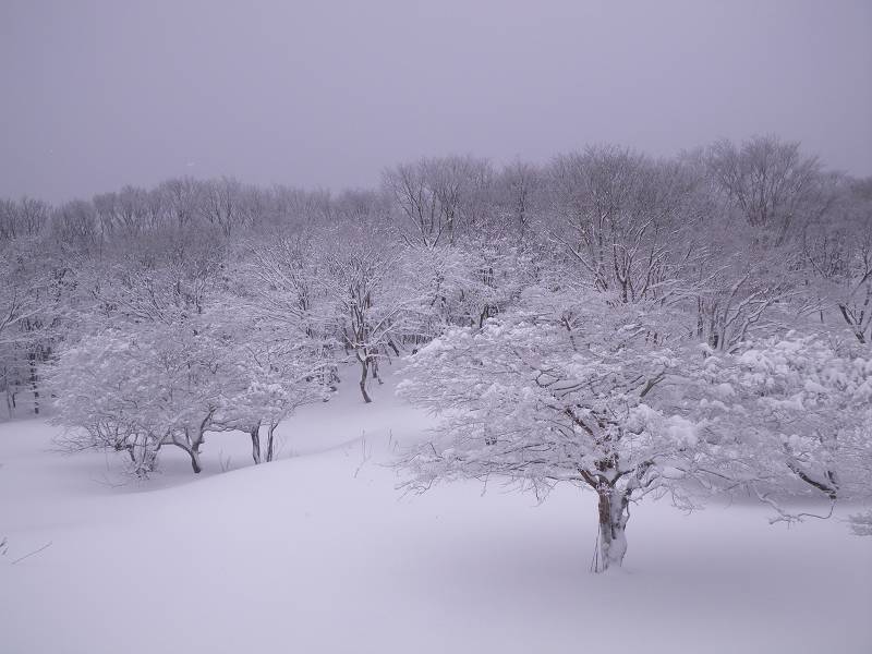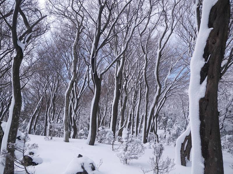 狭い山頂付近にはびっしりと灌木が生え、容易な通過を許してくれない。密な木々の枝葉は深々と雪を抱き、不用意に通ると頭から容赦なく雪の洗礼を受ける。