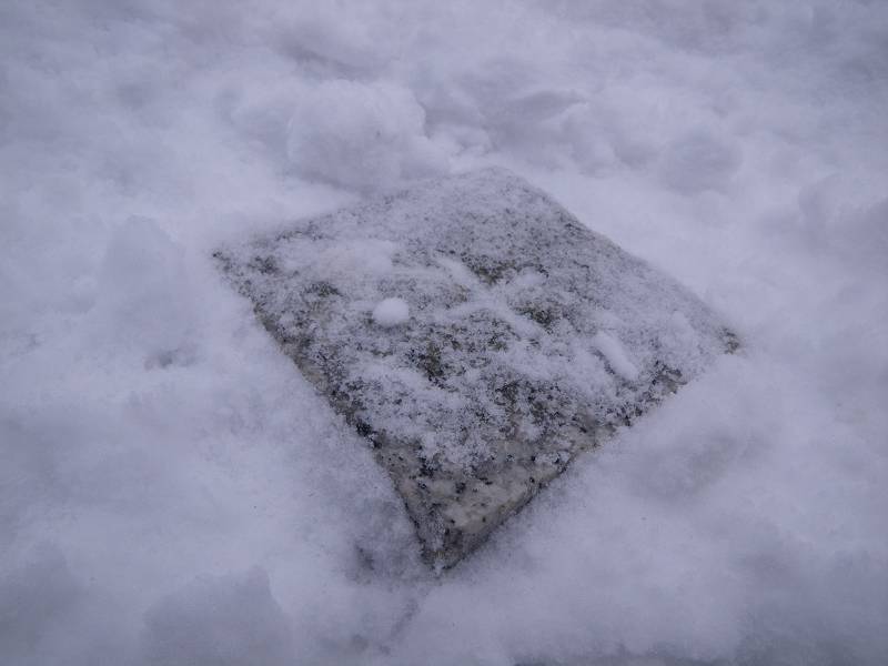 奥山山頂の小広場の中央には「大切にしましょう三角点」の標柱がある。冬眠中の標石を雪からそっと掘り起こしてみる。