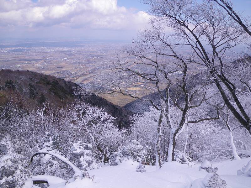 林道分岐を見てさらに林道を辿り、桜井に乗り越す峠に登り詰める頃、再び青空が覗いた。樹氷が青のキャンバスに映える。天の与えた光と影のショーに息を飲む。峠には明確な道型が登り詰め、使い込まれた乗越であることを物語っている。峠に立つと明るい濃尾平野が広がった。塞いでいた心がここで一気に解き放たれた。