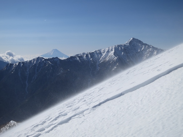 眺めは最高!北岳と鳳凰三山の間から富士山がせり上がってくる。その左にはアサヨ峰、栗沢山そこから仙水峠に一旦下って摩利支天峰を従えた甲斐駒ヶ岳、鋸岳、その後ろには八ヶ岳だ。前方には乗鞍岳、北アルプスである。雪面の傾斜は30〜35度くらいだろうか。ところがここからが想定外だった。突然風が吹き出し、瞬く間に飛ばされそうな強風になる。雪が顔にぶち当たって痛~い。ピッケルを頼りにしばらく耐えていたが、六右衛門は軟弱者なのですぐに撤収を決意。時にまだ8:00である。
