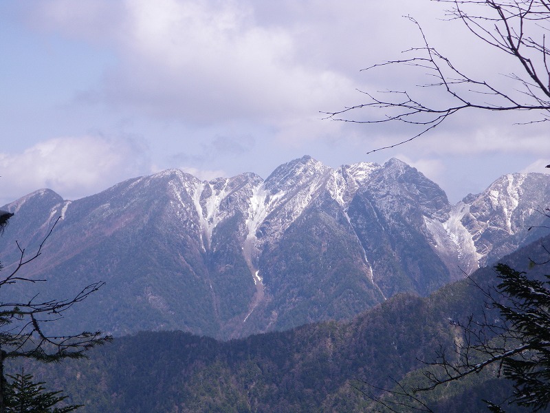 戸台大橋が真下に見える高さまで登って尾根を乗り越し、今度は戸台川沿いに進んでゆく。やがて鋸岳と甲斐駒が見えてくる。進むに連れて鋸岳を真横から見ることになり、昨年登った角兵衛沢が正面だ。鋸岳は雪解けが早く今年もコルの手前に少し残雪がある程度。