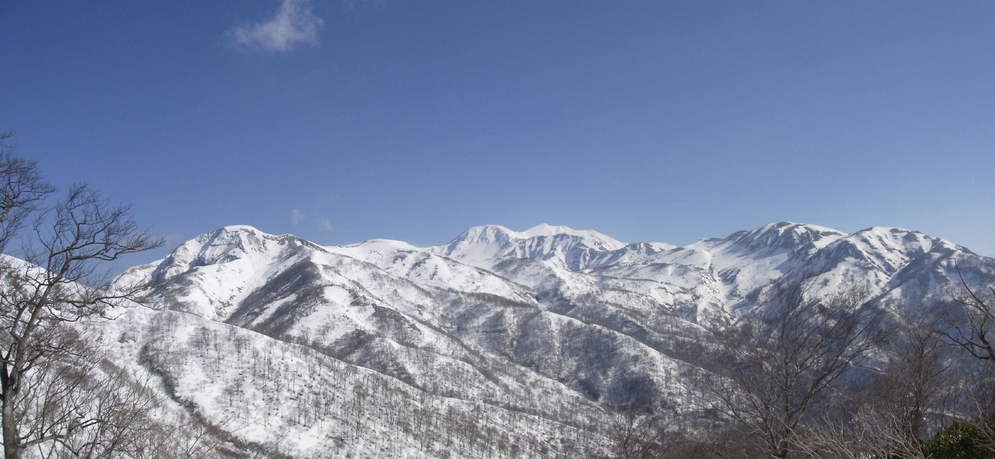 願教寺谷の奥には日岸山あたりから願教寺山への稜線が真っ青な空の下に白く輝いている。今日は天気の心配をしなくて済みそうだ。