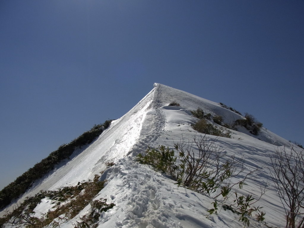 トレースは山頂直下を東に回り込んで、おなじみのピラミッド状の雪稜を上がっていた。この雪稜は何度上がっても高度感満点で気持ちがいい。