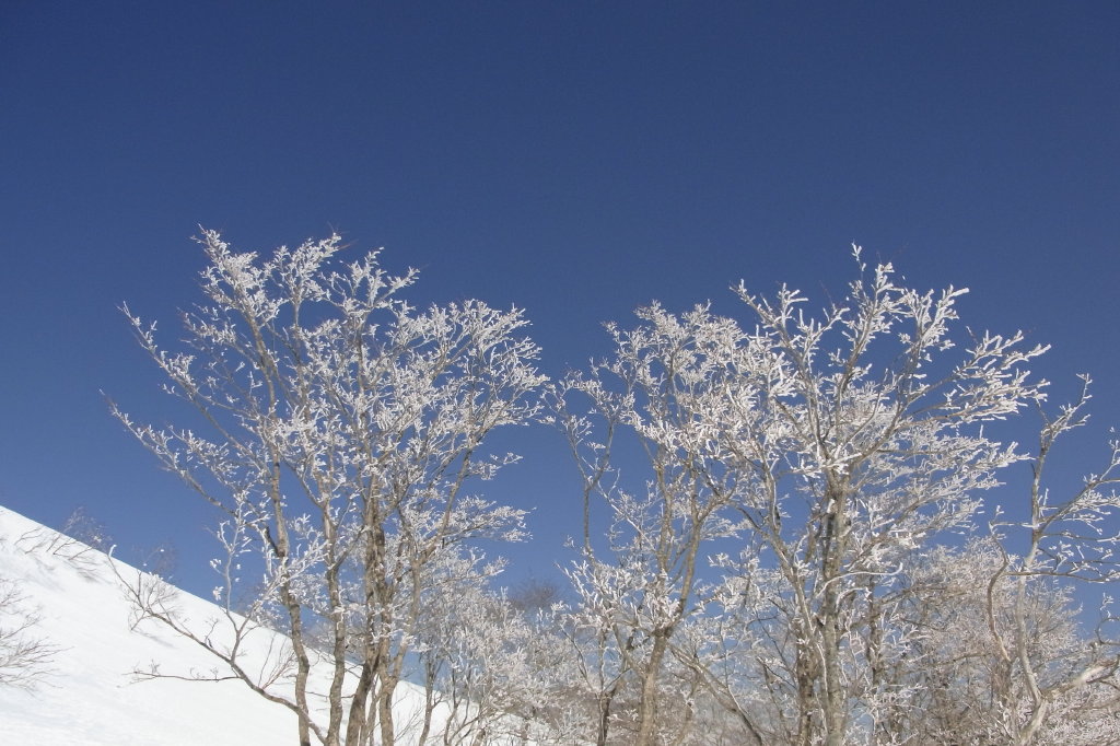 一点の曇りもない蒼空と汚れのない白雪。これ以上望むべくもない道具立てにもうひとつが加わった。立ち木に光る白い枝。霧氷である。GWに霧氷を拝めるとは夢にも思わなかった。