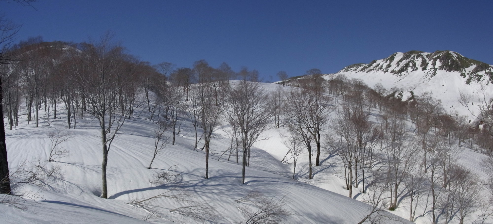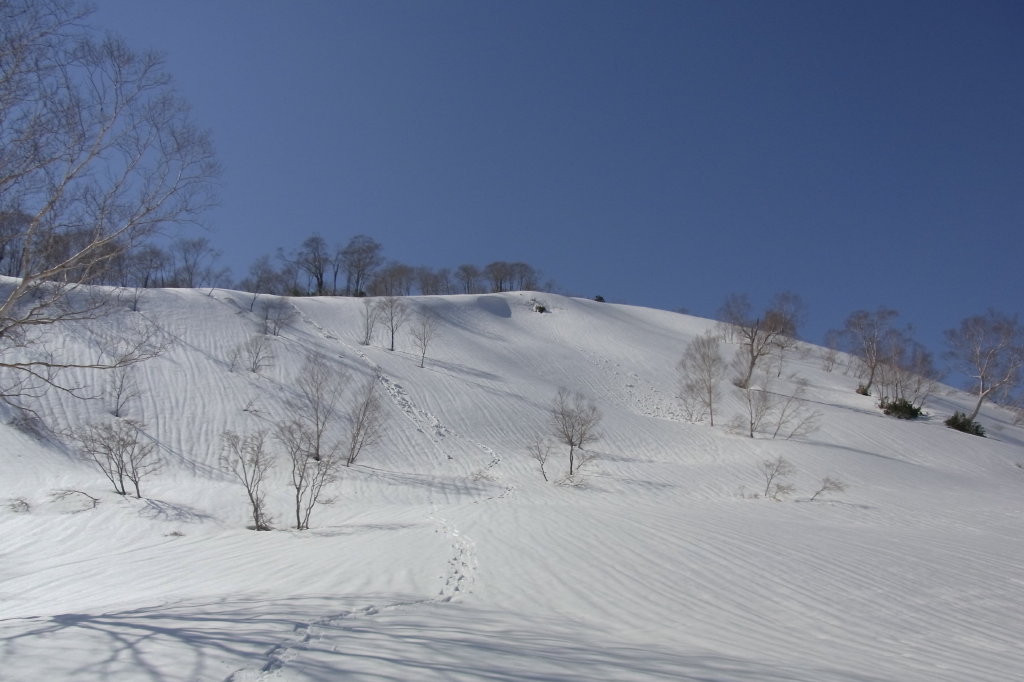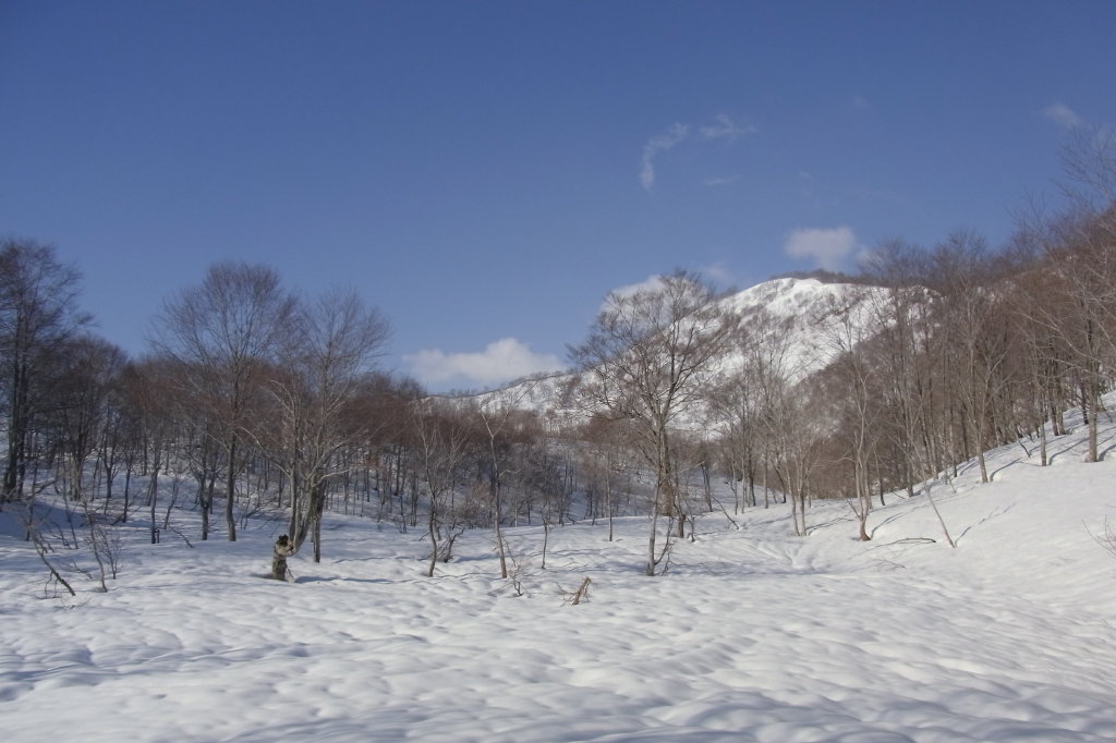 >日岸山との最低鞍部には願教寺谷の左俣が緩やかに上がっている。スキーで滑ればいかにも気持よさそうな斜面が広がる。