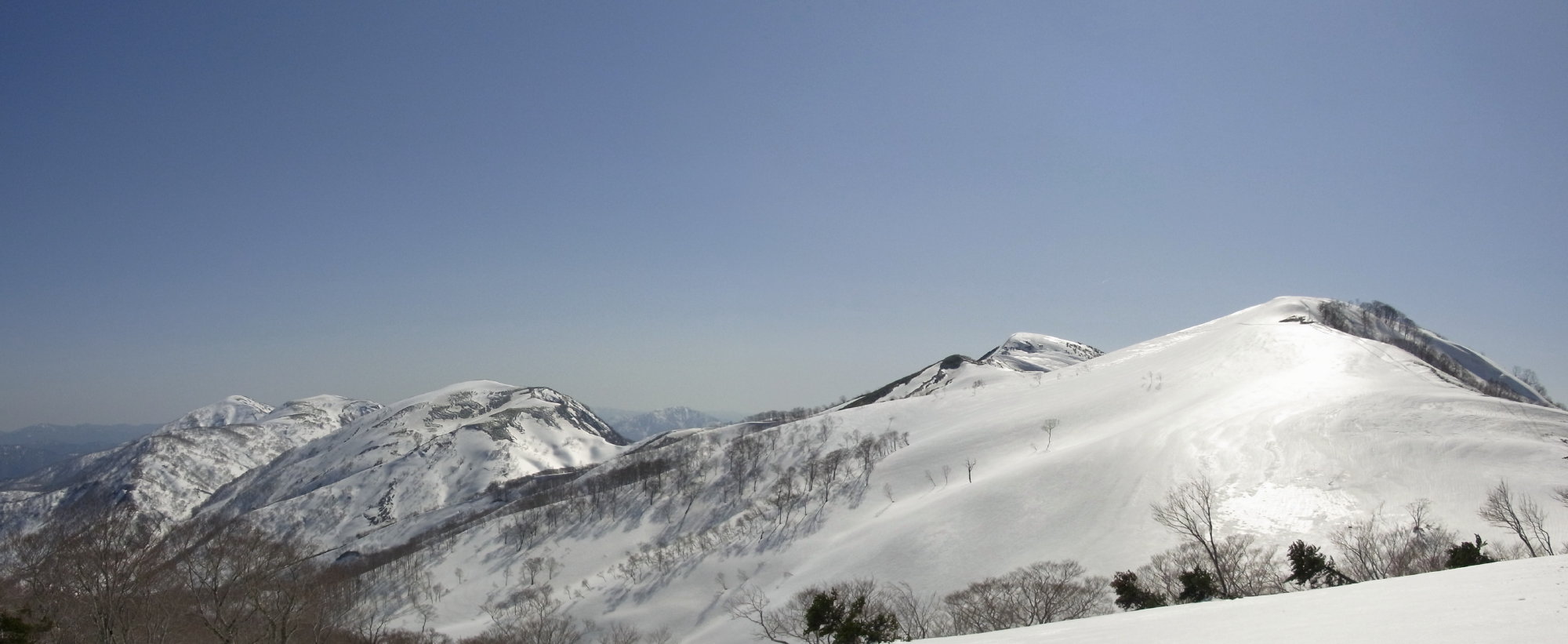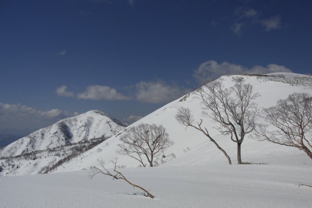 広い尾根を南に踏み出せば間もなく左下に広大な雪原が見える。あれが「中の平」だ。(ったと思う) ゆったりと広がる雪原にはポツリポツリとブナやダケカンバが点在する。下から上がって来た時の感激もひとしおだが、上から見下ろすのもまたいい。尾根を直進すると河ウレ谷側の崖に吸収されるようになっているので、平へ真っすぐ滑り降りることにした。