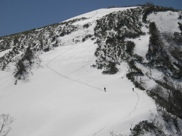 >日岸山との最低鞍部には願教寺谷の左俣が緩やかに上がっている。スキーで滑ればいかにも気持よさそうな斜面が広がる。ここからの尻セードは快感でした。