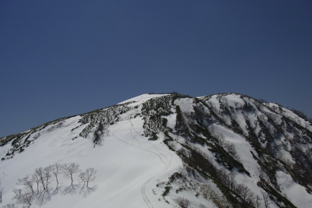 トレースは山頂直下を東に回り込んで、おなじみのピラミッド状の雪稜を上がっていた。