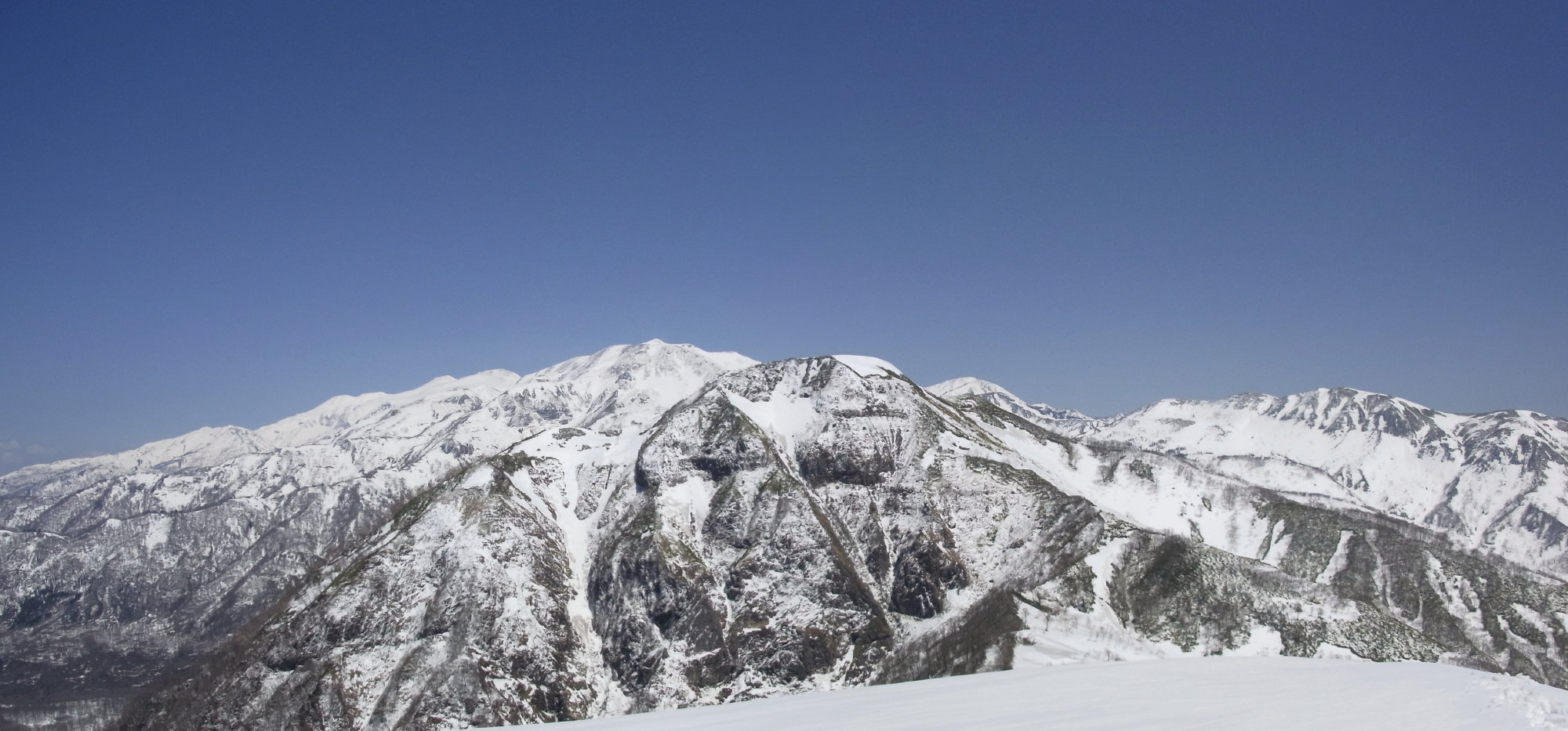 >三ノ峰の奥には御前峰、大汝峰、七倉山、白山釈迦岳と並ぶ山稜の白さが際立つ。
