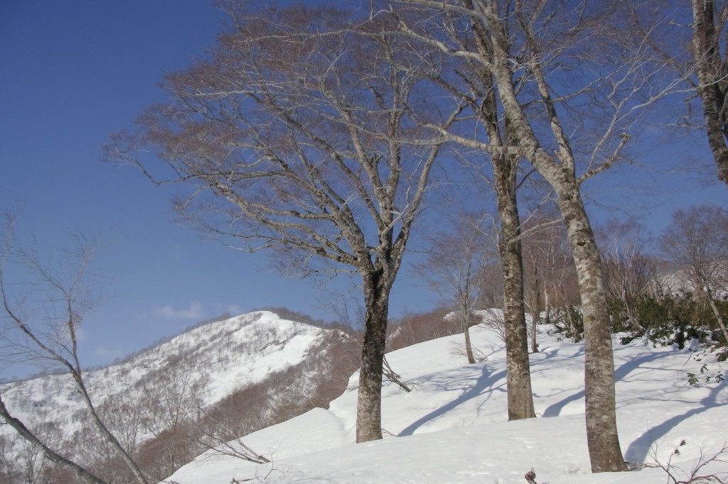一段上がった台地からは完全に雪が繋がり、もう一段上に急登すればそこは願教寺谷右岸に展開するパラダイスである。一度は伐採が入っているので目を瞠る大木こそないものの、美しい樹林が広がる雪上の楽園だ。但し積雪期限定であるが。