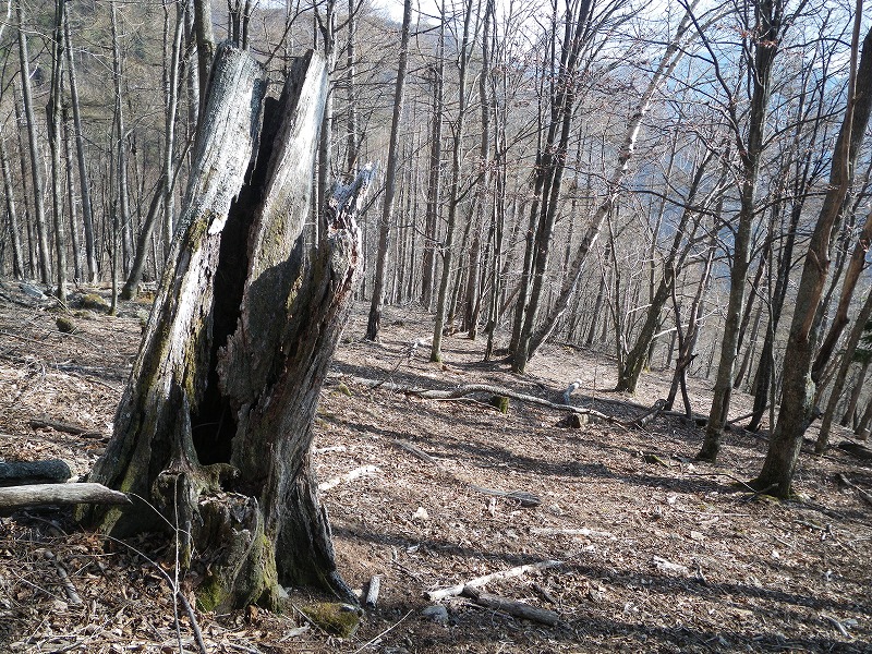 だが、明るい材料ばかりではない。藪が出たり、やせた岩場が連続する。それをどうにかこなすうち・2107に到達。ここで慎重に西を選ぶ。樹間から2400峰や地蔵岳がほの見える。この周辺の山肌には露岩がいくつも認められるが、それが地蔵岳の名の由来になった可能性もあると踏んだ。