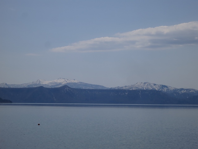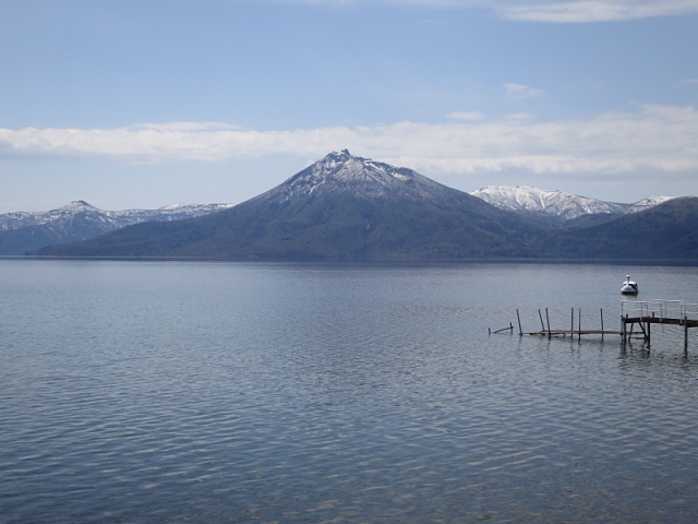 支笏湖は透明度の高いカルデラ湖で、唯一湖岸が緩やかに落ち込んでいるところから見ると、左手には風不死岳、樽前山、真ん中に低いが雪を被った多峰古峰山、右手に恵庭岳が綺麗に眺められた。特に名前と山容が美しく、何度も言ってみたい「たっぷこっぷ」です。