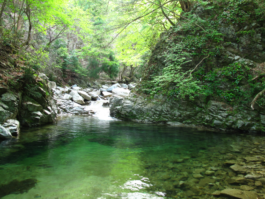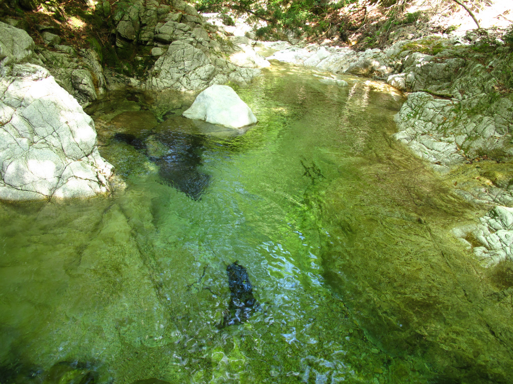 谷が狭まるとエメラルドグリーンの深く大きな淵が行く手を阻む。ここは右側の水線のすぐ下に足場があり、これを使いながらへつっていくと最後にお助けロープがあらわれ、難なく通過できた。