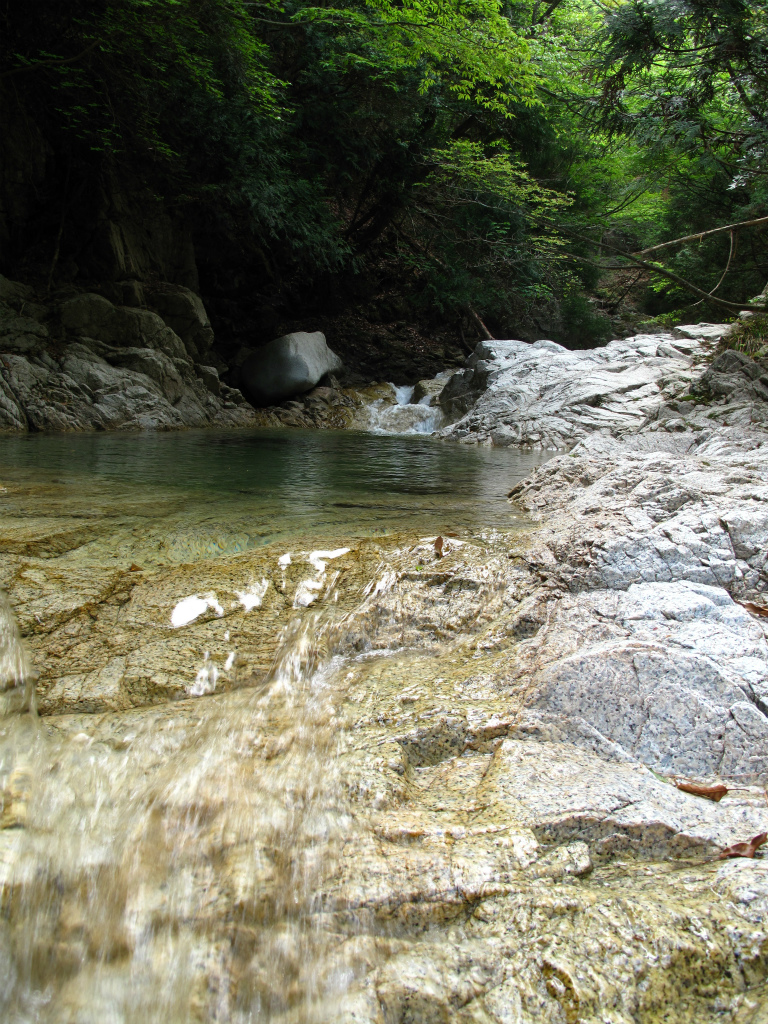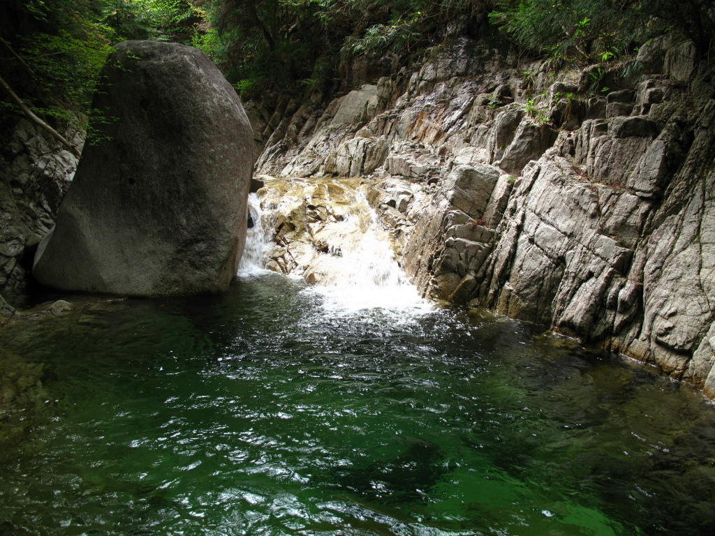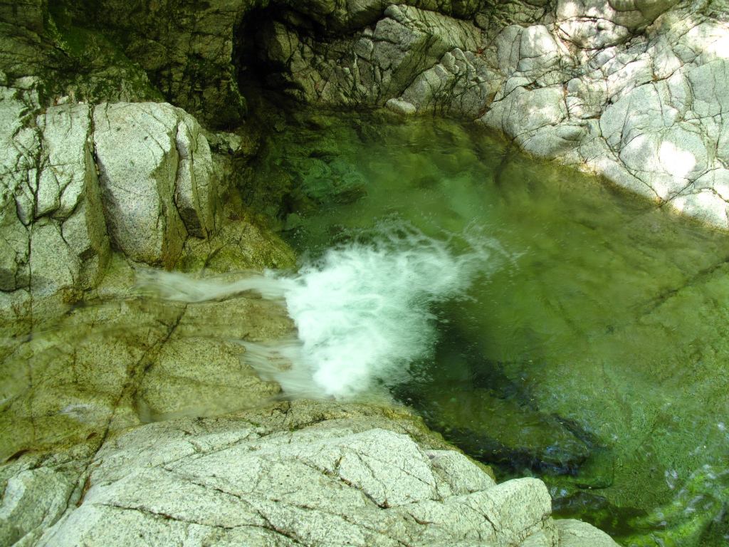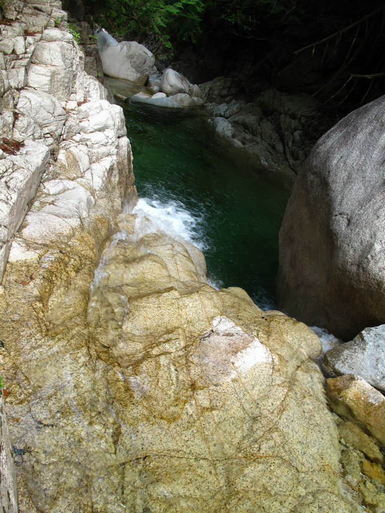 大滝の上からはこの谷のハイライト。美しいゴルジュ帯が続く。花崗岩の白とエメラルドグリーンの淵がやさしいコントラストをかもしだし、心癒される。次からつぎにあらわれる小滝や淵が目を楽しませてくれる。いくつかある深い淵もへつっていけば泳がなくてすむ。この世界は4m滝まで延々続いた。来てよかった。