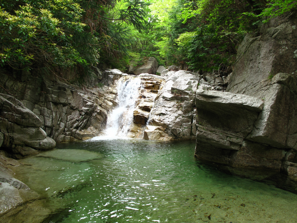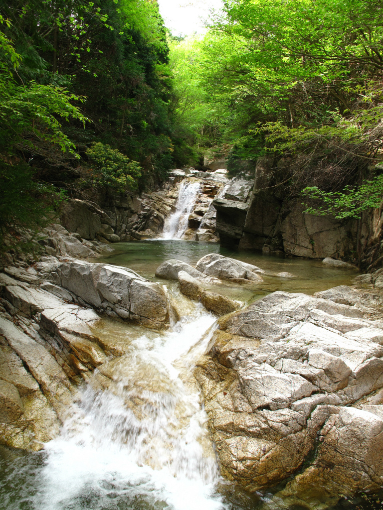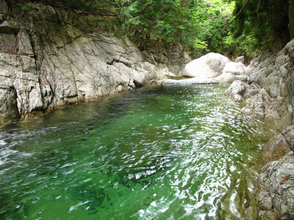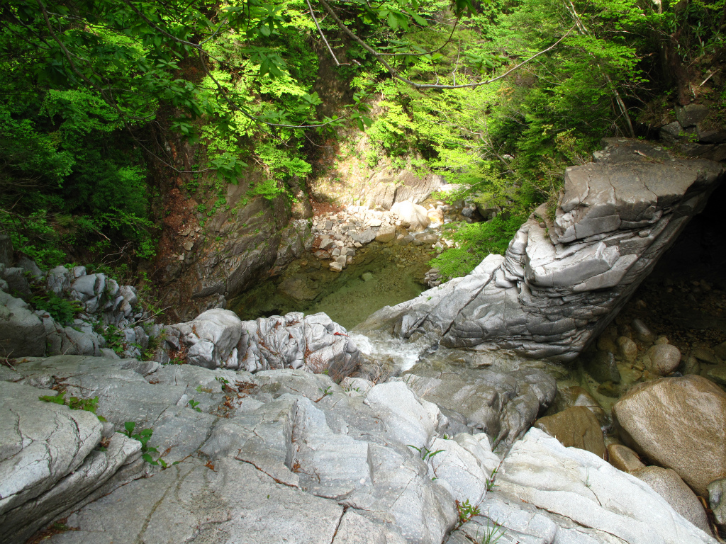 大滝の上からはこの谷のハイライト。美しいゴルジュ帯が続く。花崗岩の白とエメラルドグリーンの淵がやさしいコントラストをかもしだし、心癒される。次からつぎにあらわれる小滝や淵が目を楽しませてくれる。いくつかある深い淵もへつっていけば泳がなくてすむ。この世界は4m滝まで延々続いた。来てよかった。