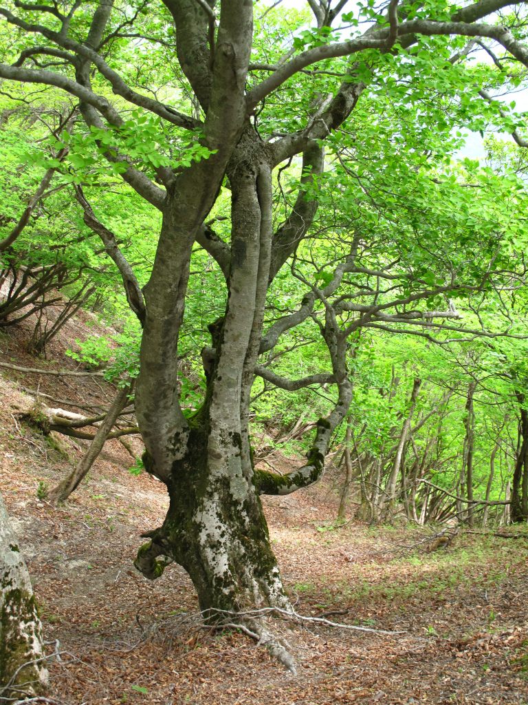 源流をつめていくとやがて水も切れひと上りすると県境稜線に出た。ここには異形のブナが残されていた。ここまでだれにも会わなかったが、水沢峠に向かうわずかの間に二人の登山者に出会った。登山道は人が多そうだ。