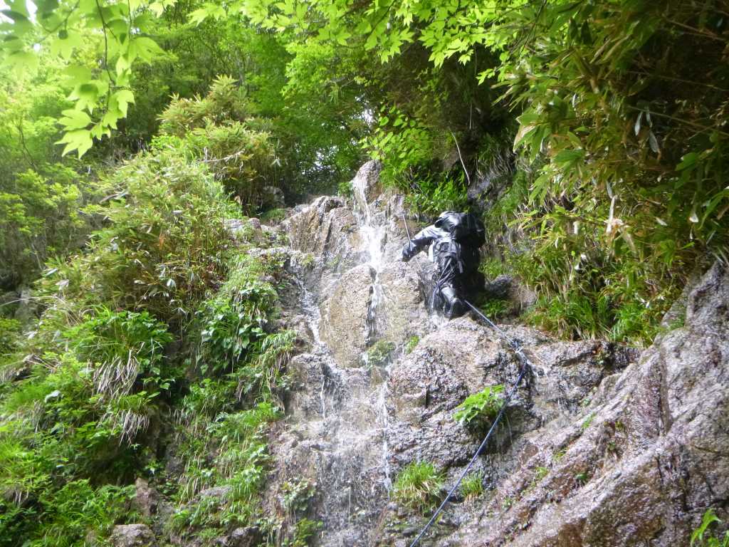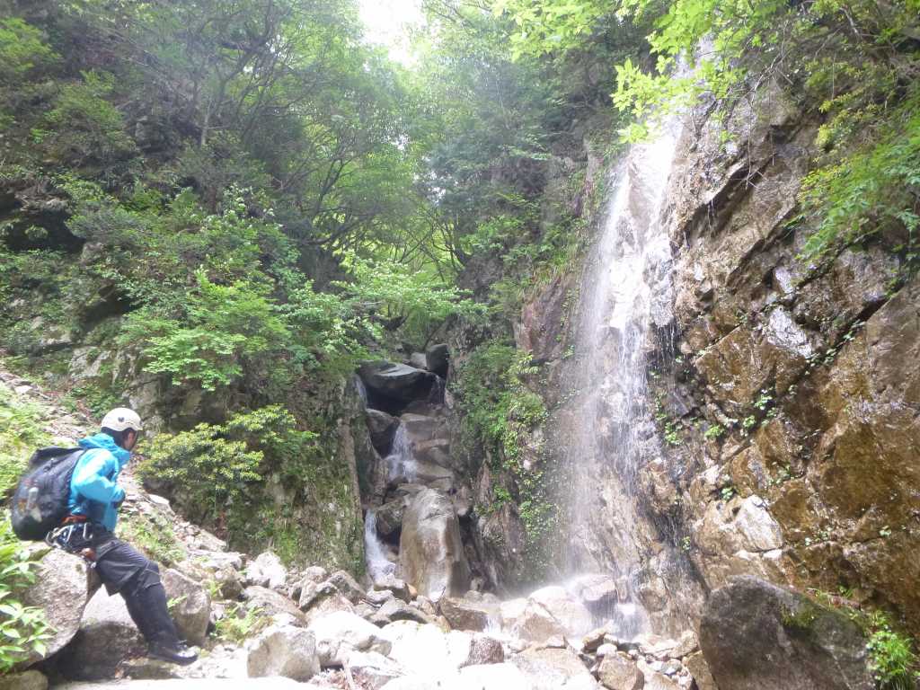 林道をしばらく歩き入渓する。中ノ谷は初めてなので楽しみとちょっとの不安。最初の堰堤を右から越えていくと10m大滝のお出迎えだ。水量が多くてちょっとビビる。今日はたろーさんが切り込み隊長なのだそうで、たろーさんがロープを引いてトップで登る。ハーケンを打ち、2か所で支点をとっている。単独沢行が多い私にとってはこのような登攀的な滝登りは初めてなので興味しんしんで眺める。2番手がmichiさん、私が3番手だ。最初からシャワーでの滝登りになる。いざ登ってみると手掛かりもしっかりしていてそれほど難しい登りではないが、水量が多いので流れを横切るときに流されると一挙に滝つぼまで落ち、ただでは済まないだろう。 しばらくゴーロ歩きが続いた後連瀑帯に出る。今日はすべて水線を直登していく予定なのだそうで、すべてシャワーで登っていく。ゴルジュ入り口の5m斜滝もたろーさんがトップでロープを引いていく。とりつきがちょっといやらしいが、とりついてしまえば足がかりはある。ステミング気味に両手両足を左右の壁につっぱってとりついている。途中で支点をとろうとしているがうまくとれないらしく、結局フリーで登ってしまう。 続いての7mの滝は流芯を横切っているバンドを伝うので水を頭から浴びながらのシャワーだ。雨具をかぶって突破するがそれでも全身びしょぬれだ。もっともその前にとっくにびしょぬれになっているので構わないんだけど。今日は気温が低いようで、後続を待つ間に身体が冷えて震えてくる。もう少し厚着をしてくればよかった。足の筋肉が冷えたようで、両足のふくらはぎがつり気味だ。だましだまし歩いていくがどうなるかちょっと不安、たろーさんも足がつり気味だそうだ。しかし、次の6m滝をシャワーで登っている間すっかり足の事は忘れて、いつの間にか筋肉が元に戻って快調になる。 いくつかの滝を快調にこなしながら登っていくと、右から水が垂直に落ちている。これが北中ノ谷の入り口だそうだ。この滝はもちろん登れないので、最初左俣を登ったあと斜面をトラバースして北中ノ谷に入るのだそうだ。左俣の滝は一見簡単そうだが、最後のチョックストーンの抜けがいやらしい。狭い岩の間をすり抜け、斜めになった岩の上を身体全体を使った摩擦抵抗で腹ばいになりながら突破する。 北中ノ谷へのトラバースでは全員ロープをつないで突破する。間に立木が入るようにして行けば、誰かが落ちても立木が支点になって滑落は防げるのだそうだ。それほど危険なトラバースではないが、危険なトラバースの突破法として勉強になる。それからも危険そうな滝はロープで確保しながら突破していく。