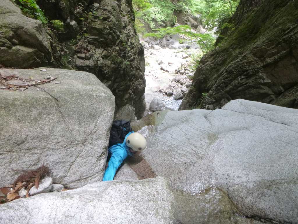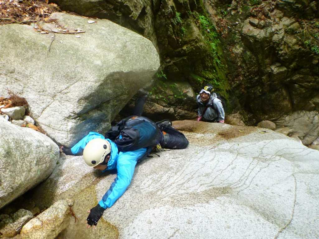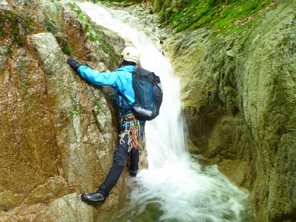 昼食後、michiさんがトップで登り始める。クライミングと同じ要領で支点をとっていく。通常のゲレンデでは支点用のハーケンが打ってあるのだが、沢登りではこのような人工の支点はない。カムを使ったり、ハーケンを打ちながら支点をとっていくのを見るのはとても勉強になる。そのうち私もトップで登れるようになりたいものだ。えっちゃんが2番手で、私がその次。下から見ているよりも壁が立っていて手ごわい。それでも手掛かりはしっかりしているので慎重に登っている限り問題はない。無事に登り切る。あ~、楽しかった。やっぱ、沢登りは滝を登ってなんぼのもんだねえ