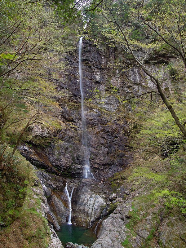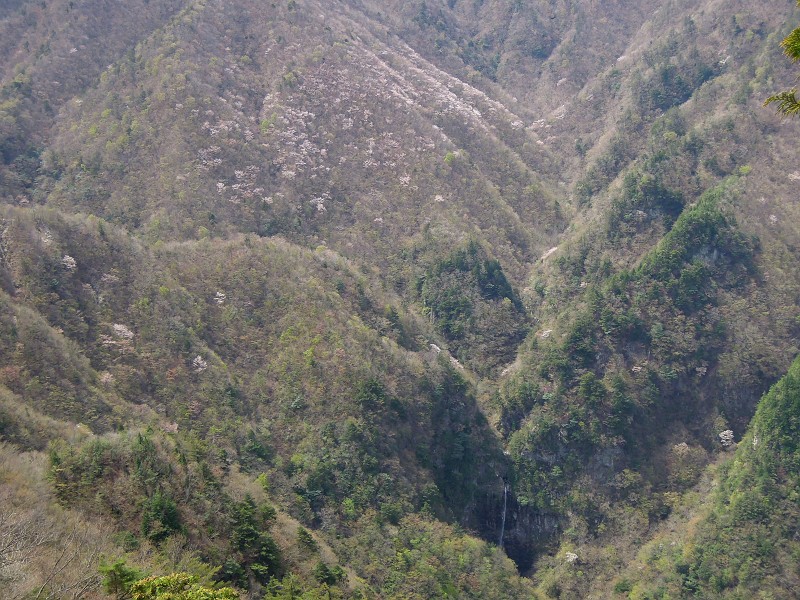 絶壁の岩崖から張り出した木の根っこに乗れば、新緑のはじまった中に落ちる風折れの長瀑、風折滝上流の砥石谷・水越谷に挟まれた冬枯れの山腹が見事に山桜で薄桃色に染まっているのが望められた。時期的に若干早いが、上等な十二分な望めだ。