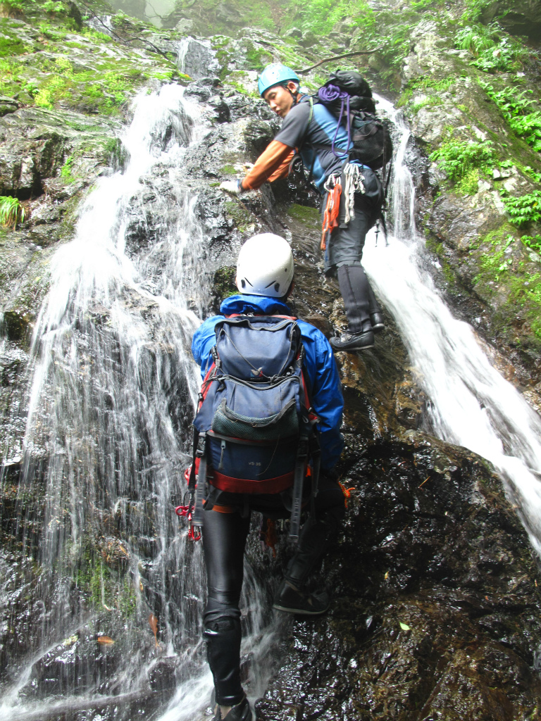 チョックストーンのある8m滝は大岩を越えるのだが,リーチが短い私では無理。登攀力があるわりばしさんがトップで突破し,スリングで引っ張り上げてもらう。美しい2条7mの滝では寒くてもうシャワーはごめんと言うたろーさんに巻き上がってもらって,上からロープで確保してもらう。流れの真ん中の溝をたどってシャワーで直登する。わりばしさんが苦労しているので,そんなに難しいのかなと思って自分の番になると,たしかに流れの中はすべすべで手がかりが何にもない。なんとかずり上がって,たろーさんに引き上げてもらう。 8m滝を巻いたあたりで昼食にする。昼食後,たろーさんにロープワークに必要な道具類を見せてもらう。ハーケン,カム,ハンマーなど。またお金がかかりそうだが,命と引き換えにはできない。たとえ滑落しても最低限命だけはなくさないような工夫が必要なのだ。