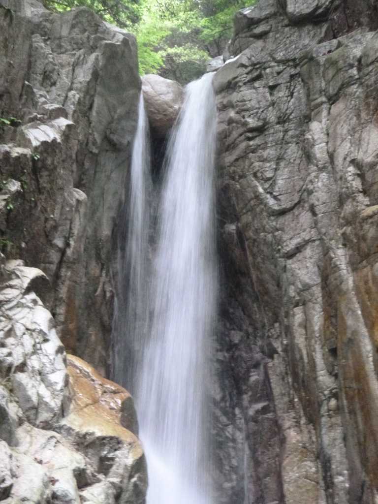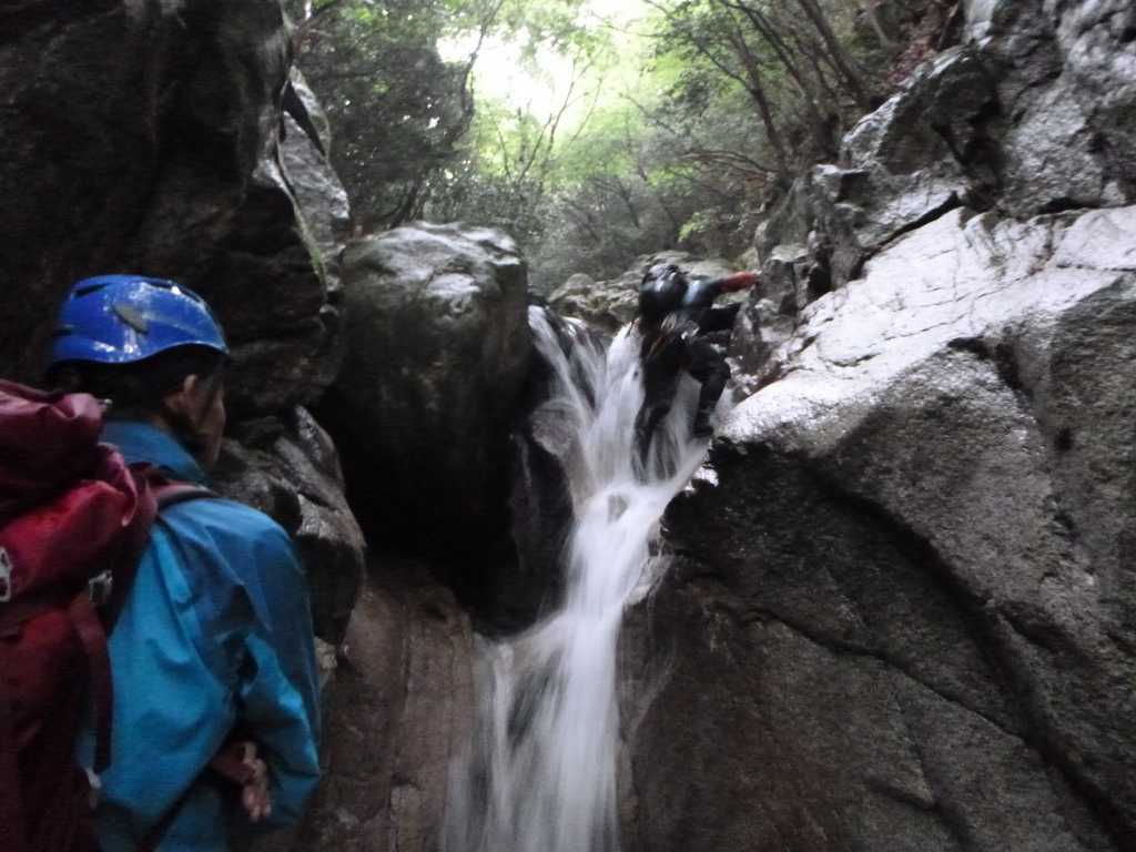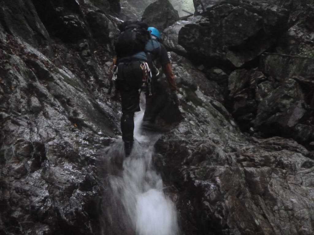 上空は雲がたれ込め,谷中は夕方のように暗い。続く15m滝は右岸のルンゼから木の根をつかんで巻き上る。美しい滝だ。次の5階滝の一部の10m滝は右岸巻き。前評判通り,次々と滝が現れて飽きる暇がない。 廊下出口のチョックストーン滝は流れの真ん中をシャワーで登り,大岩の下をくぐりぬける。次の廊下の入り口の10m滝ではたろーさんにロープワークを教えてもらう。一応,クライミングで確保の仕方などは習っているのだが,私が行くようなゲレンデではすでに支点がうってあって,それにヌンチャクをつけるだけで事足りる。沢ではカムやハーケンを使ってまず支点を作らねばならないし,クライミングでは経験しないような臨機応変さが必要だ。 次の7m滝では練習のためにトップを行かせてもらう。カムを使ってみようとちょっとしたクラックにカムを入れてみるが,サイズが合わなくて固定できない。やっぱり難しいものだ。