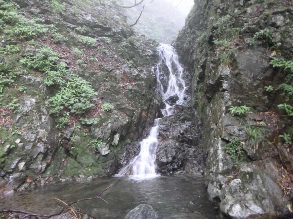 昼食後はたろーさんがトップを行く。簡単に直登できる滝が続いているので,ノンストップだ。「おいおいちょっとペースが早すぎるんじゃないの」と言いたいところだが,ここは男の意地にかけてもそんなことは言えない。必死にくらいついて行く。あっという間に源頭部の笹原に出る。ここからは笹こぎだ。さっきまでの無理がたたってもうガス欠状態。次第にたろーさんやわりばしさんにおいて行かれるようになる。笹原が出てきたということはもう頂上まで近いはずなんだけど,ガスで展望が利かないのでどこまで歩かなければならないのか見当がつかない。体力がつきる直前になって,ポンと頂上に飛び出した。もうへろへろ状態。 頂上はホワイトアウト状態。当然誰もいない。靴を履き替えて,金山尾根から下山する。蛇谷はいろいろなブログにあるように直登可能な滝が延々と続き,全く飽きることがない谷だった。滝ノボラーにとってはこれほど楽しい谷はないだろう。たろーさんが何度も通うのもうなずける。鈴鹿の名渓といえる谷だろう。今度はもう少しのんびり歩いてみたいものだ。