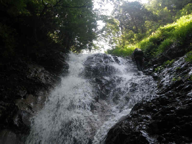 右岸の炭焼釜跡を見て進んだところに3mほどの滝。ここは両岸立っており嫌が上にもシャワークライムしなければならないが幸い登りやすい。