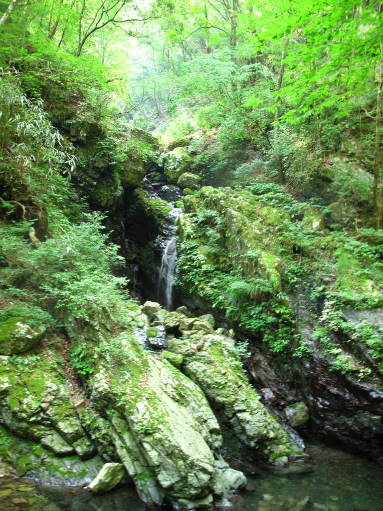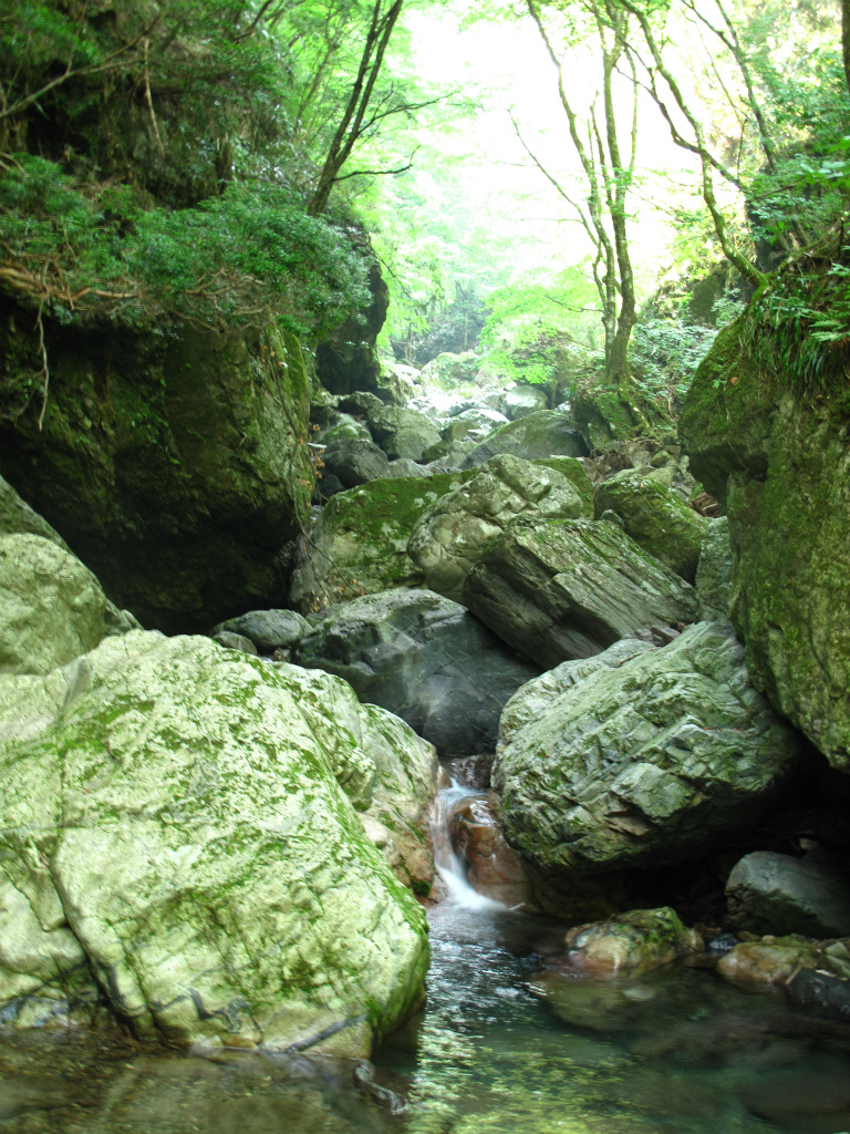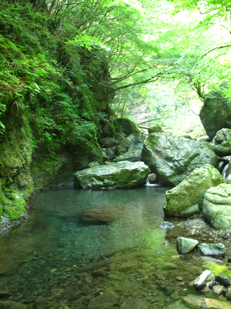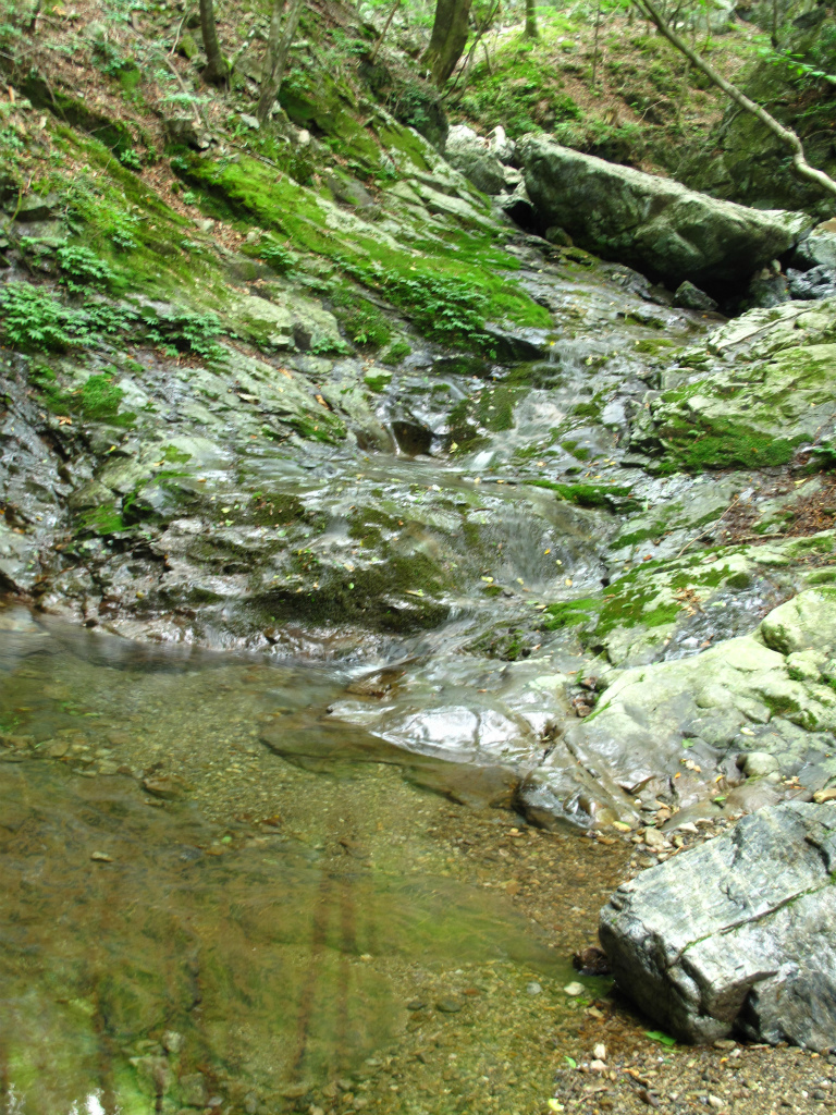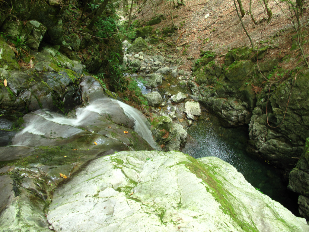 谷は平凡になるが左岸は切り立った岩壁になっており、迫力がある。渓流にはアマゴの魚影が濃い。この付近の岩には緑の苔がついており、大雨が降ってもいきなり増水することのないアマゴにとって住みやすい豊かな渓流なのだろう。こうした山域の雰囲気を肌で感じることができるのも沢登りの楽しみのひとつだろう。