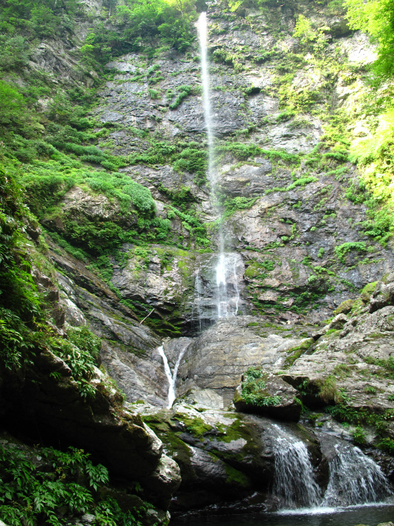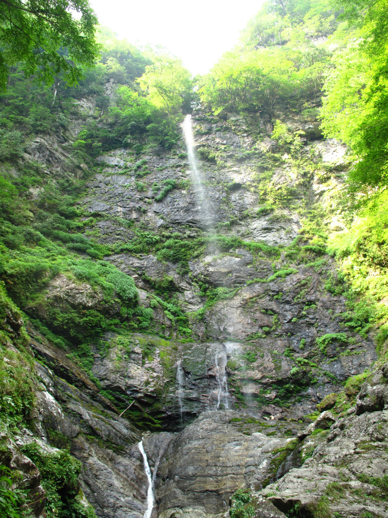 すぐに風折滝が目に飛び込んでくる。屏風のように広がる岩壁に一筋の流れが真っ直ぐ落ちている。高さは70mあり風が吹くたびに滝の中程から水流が折れて霧散することから風折滝の名がついた。風が吹き抜け、右に折れたり左に折れたりしているので上空は風がまいているようだ。風折滝にはまだ行ったことがないんですよねえ。もう少し涼しくなったら行ってこようかな。