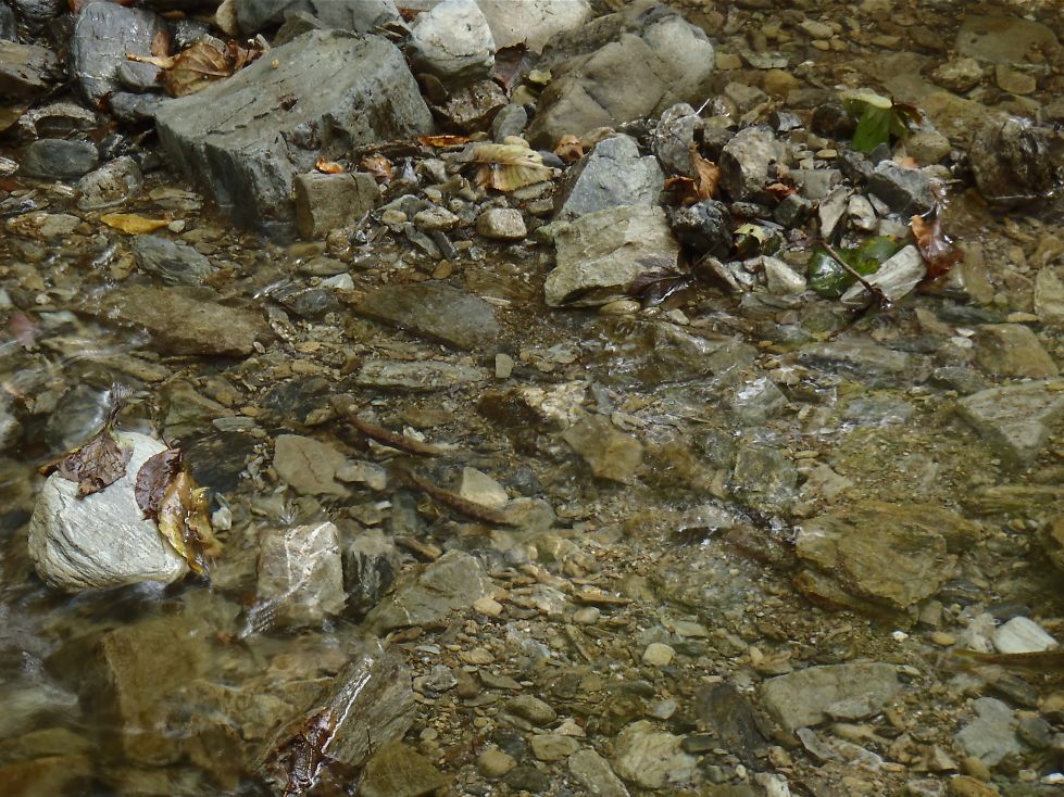 小尾根を上ると滝見尾根に突き上げる尾根に出た。いつもたどり着く地点よりかなり上部に出たようだ。少し下ったコルから緩やかな斜面をトラバースし小尾根を越えると岩の詰まる谷に降り立った。この谷には水も流れておりしばらく下ると水越谷に出た。
