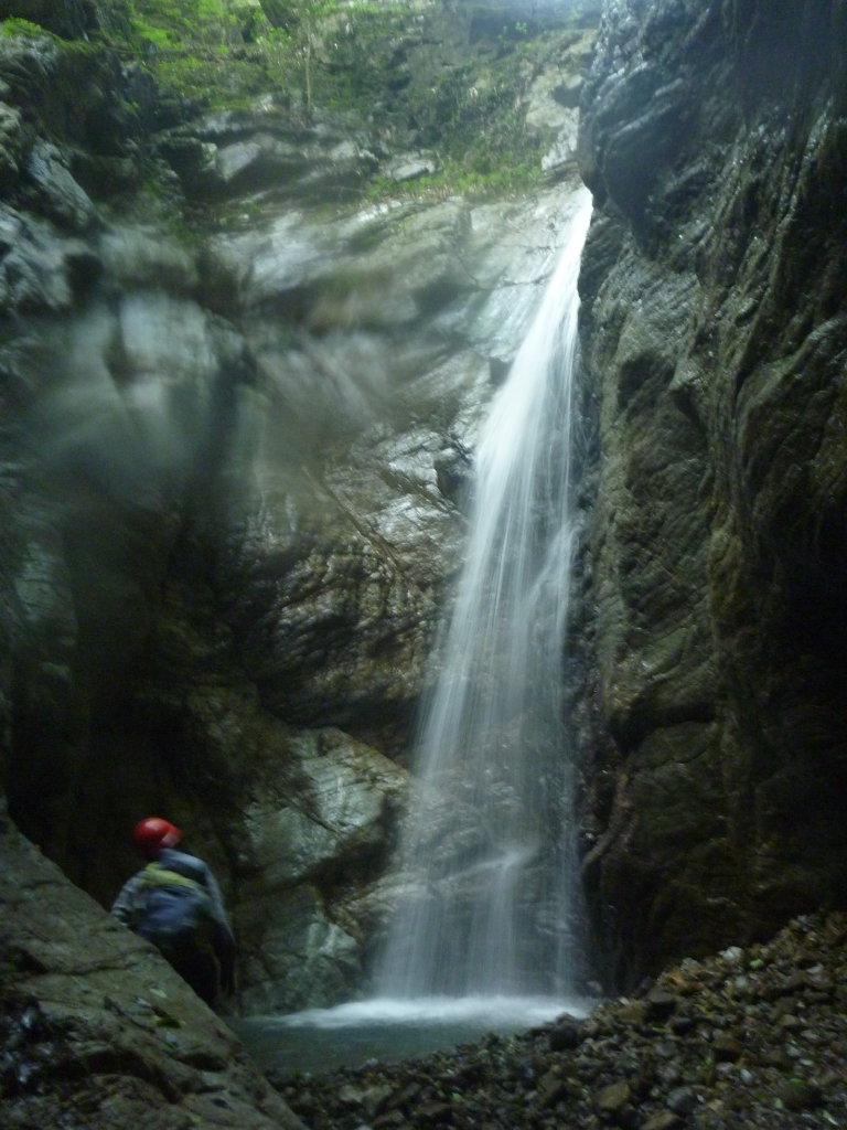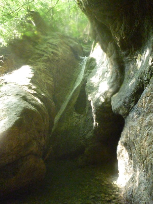 開けた谷は急角度に右折すると突然薄暗いゴルジュに突入した。両岸の岩壁は30m以上あるだろうか。谷の巾は2mばかりしかない、まさに廊下といった感じである。S字に屈曲した突き当りに現われるのが不動滝である。、頭上の丸く切り取られた空から届く光は、まるで井戸の底にいるような錯覚を覚える。この圧倒的な自然の造形には畏怖の念さえ覚えてしまう。